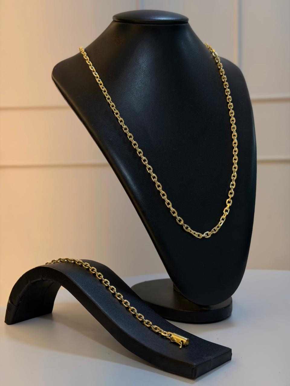 Produzido 100% na moeda antiga, o kit oferece excelente resistência e acabamento premium. A corrente e a pulseira formam um conjunto harmonioso, ideal para quem gosta de acessórios combinando e com presença marcante.
